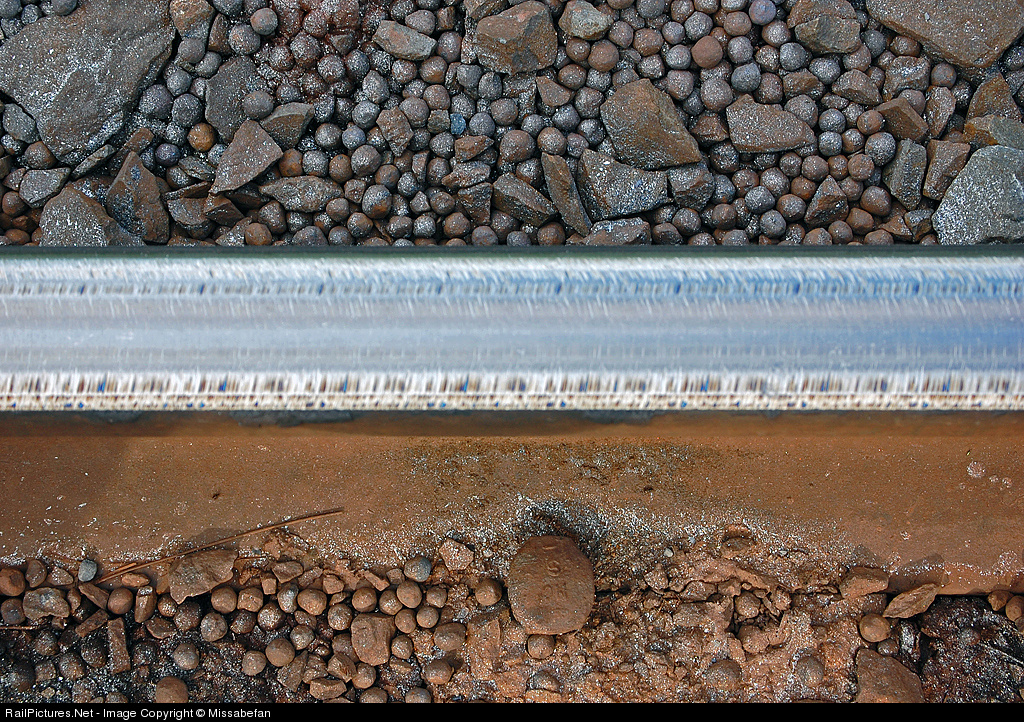 | A little off the top for the Missabe Subdivision Main Two is evident by the metal shavings covering the taconite pellets and ballast rock and grinding marks on the railhead after the passing of the Loram Railgrinder RG 309. |