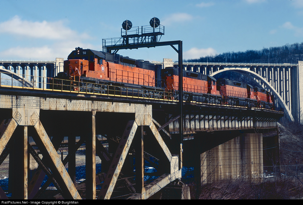 | For a brief period of time, the Union Railroad used five ex-B&LE SD38-2's in road service. Four of the big EMD's were heading south thru East Pittsburgh with an ore train from North Bessemer. The engines were too big and heavy for service on the URR and were quickly sidelined. |