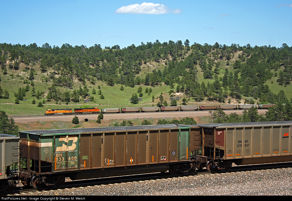Empties have looped around itself at the famous Crawford Hill horseshoe curve, as they gently glide down the 1 plus percent grade towards Crawford, Edgemont and eventually the Powder River Basin.