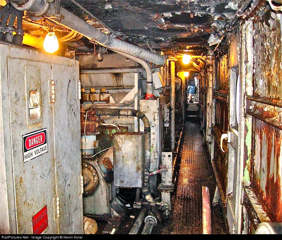The engine room of the FP45 as viewed from the back of the locomotive. The room up ahead is the cab.