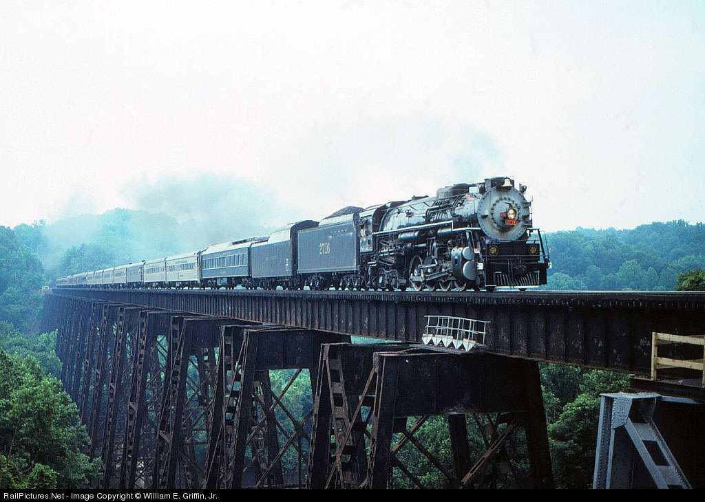 | Former C&O 2-8-4 No. 2716 pulls a northbound Southern Railway excursion train across the James River Bridge on Independence Day 1982. |