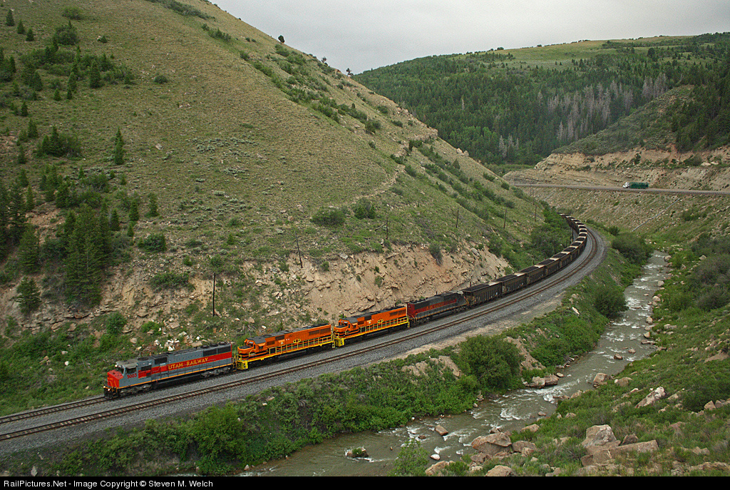 Four of Utah's finest motors (two MK's bookending two Aussie SD50's) drag a heavy Utah coal train through the depths of the Price River Canyon.