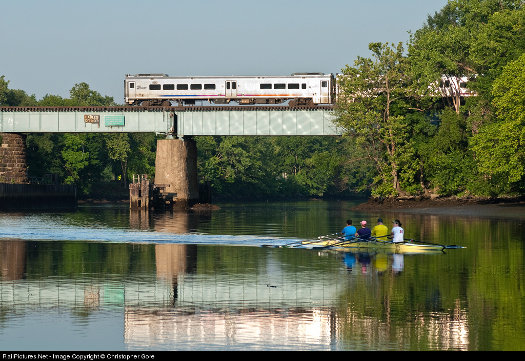 Cab car 6010 of New Jersey Transit crossing the Passaic River while a quad scull rows upstream.