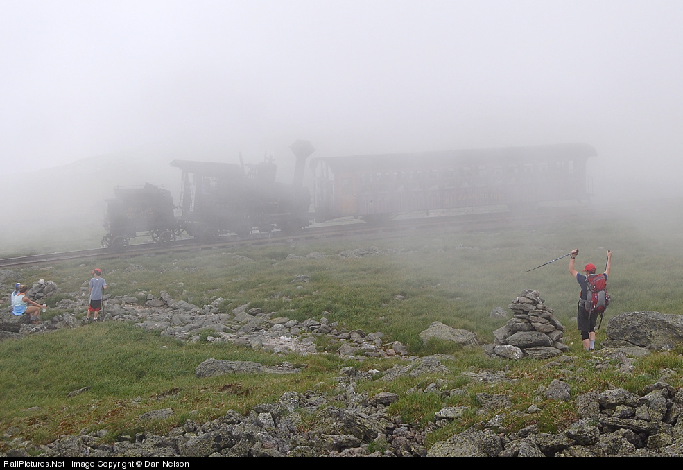 | Hikers on Mt. Washington's Great Gulf Trail pause to watch the only steam powered train of the day head down the mountain. Weather on the mountain can be sporadic, as evidenced by this train passing though thick fog on what was mostly a warm and sunny day. |