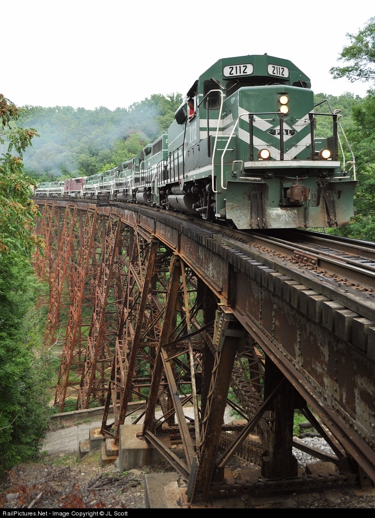 Empty hopper train LG1 crosses the "high trestle" as it grinds up Muldraugh Hill between West Point and Fort Knox. This is the southward ruling grade on the P&L. Today's train has a rather interesting consist with eight units total: 2112 (slug), 2119 (GP40-3), 3800 (GP38-2), 8507 (GP39-2), 2123 (GP40-2), CEFX 121 (SD9043MAC), 2113 (GP40-3), 2114 (slug). These units came up the previous evening on LG2, loaded coal, running as a distributed power train.