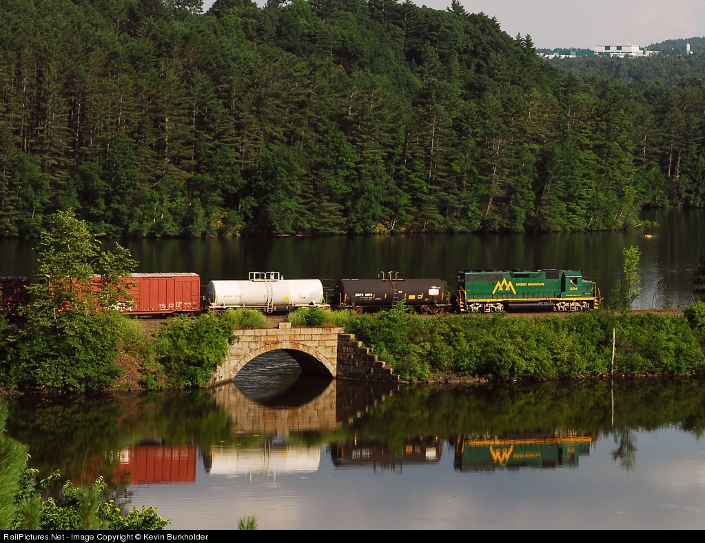 | Green Mountain Railroad Co. GP40 304 is seen leading WACR southbound train NPWJ through Norwich, VT, with the sprawling Dartmouth-Hitchcock Medical Center sprouting up from the moutainous terrain above the locomotive. |