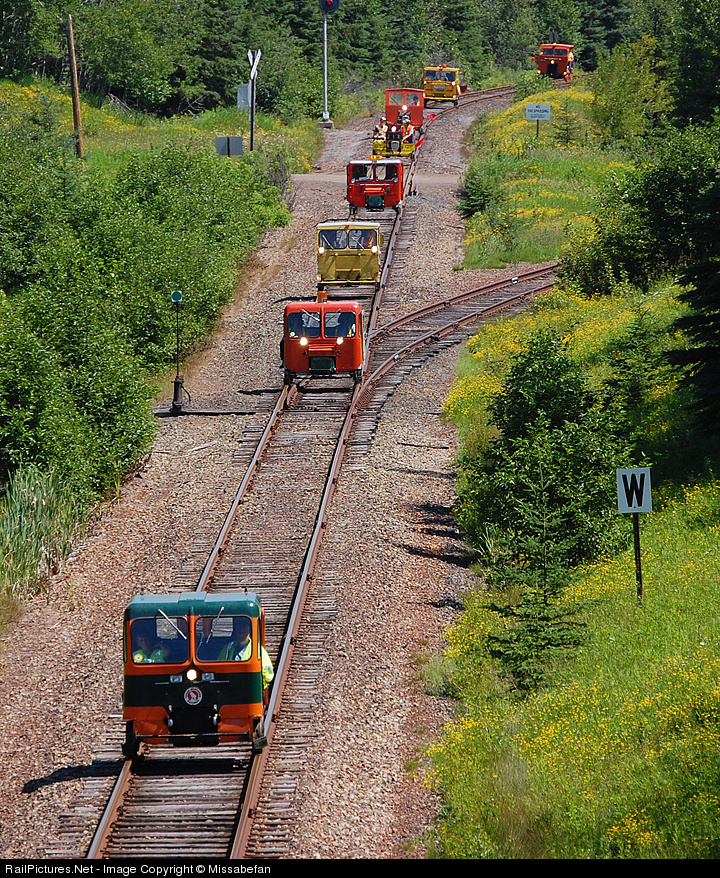 | After leaving the former DM&IR depot in Two Harbors, the NARCOA (North American Rail Car Operators Association) speeders head down the North Shore Scenic Railroad along Lake Superior towards the depot in Duluth for the day. |