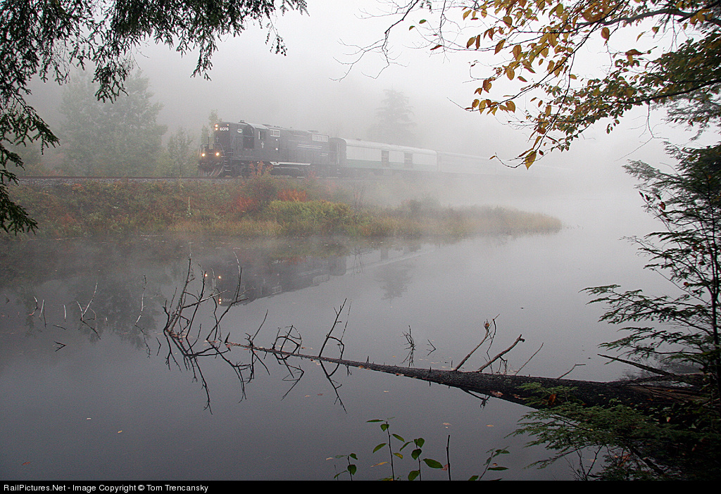 The Adirondack Scenic RR uses a Geep lettered for the Adirondack & St. Lawrence RR [#6076] and is shown southbound one mile south of the Thendara depot in a thick morning fog. Within three miles the sun is showing brightly and the train continues south in full fall colors.