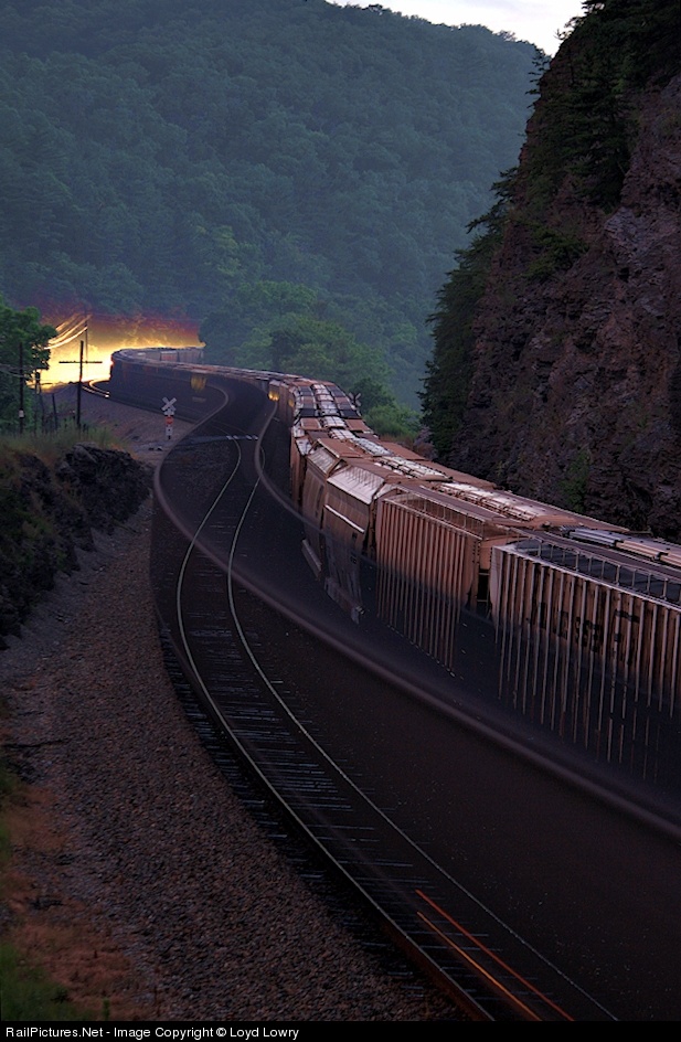 Night Meet at Moss Run. An empty Westbound grain awaits an Eastbound coal train to clear the single track at OX Cabin. Shot was taken with the use of a black card to let the engines come through the frame without glaring the shot. A 200 second exposure @ f6.3, ISO 100.