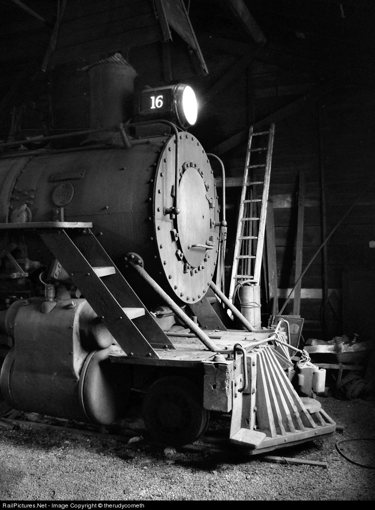 East Broad Top mikado #16 sits forlorn in the Orbisonia roundhouse, missing her number plate. This locomotive has not operated since 1955, as it was undergoing a major overhaul when EBT shut down in 1956. She still awaits the completion of this overhaul silently in the roundhouse.