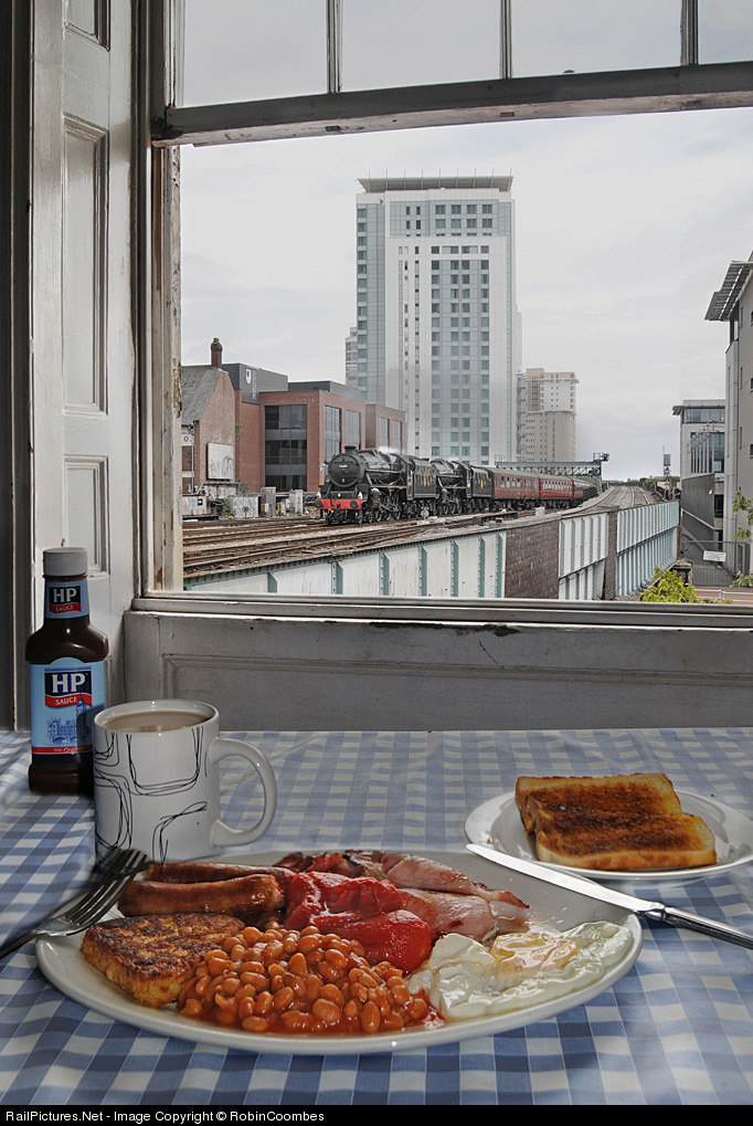 The great British Breakfast together with a view onto the approaches to Cardiff Central Station. Black 5s 45407 and 44871 arrive with the Heart of Wales tour on route to the Central Wales line and eventual destination of Manchester