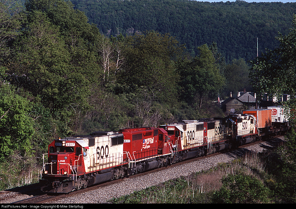 | In the 1990's it seemed like SOO power was just as common as CP power on the CP's D&H operations across the Southern Tier. Train 261 has 4 SOO units and a CP unit as it rolls thru Chemung, NY. |