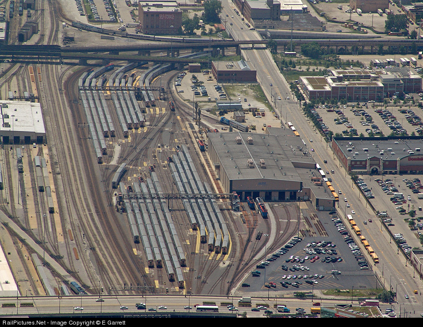 Commuter consists crowd the tracks surrounding the Metra shops, awaiting the evening rush. Seen from the south side of the Skydeck, atop Chicago's Willis (formerly Sears) Tower. Make room for this on your basement layout!