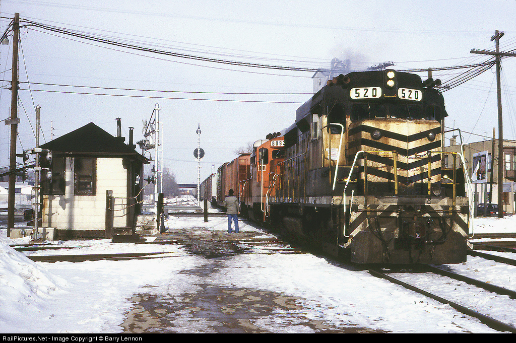 | GP30 #520, still wearing its original GM&O paint scheme, leads a southbound out of the Bloomington yards past BN Target tower. The tower here protected the crossing of the ICG's Chicago to St. Louis main with the N&W Peoria branch and Conrail's Pekin branch. BN Target was always considered an unapproved interlocker, requiring all trains to stop at the home signal before proceeding. |