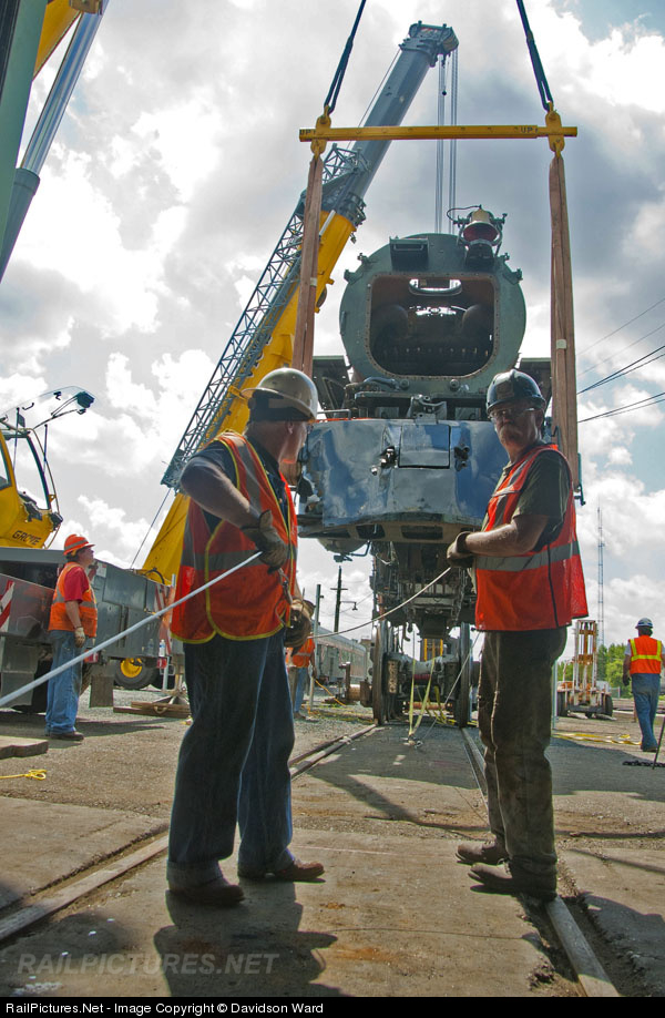 With 261 hovering overhead, volunteer Pat and long-time employee Jim French (eyeing the camera) hold a cable together until the electric hoist used to pull the 14,000 lb main driver engages completely. The Friends of the 261 lifted the locomotive in order to remove the main drivers for re-profiling at a nearby shop.
