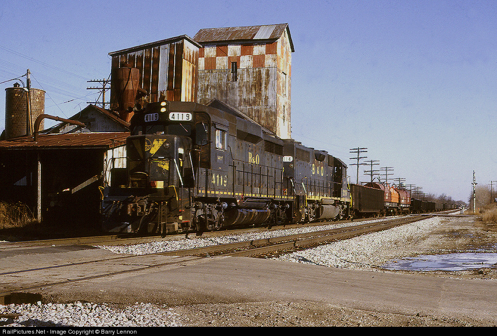 | A B&O painted GP30, with its original sunburst scheme showing through, leads an empty scrap steel train west towards Gary, Indiana. |