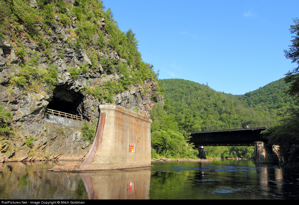 The Turn Hole Tunnel: Constructed in 1866 by the Lehigh and Susquehanna Railroad, this tunnel eventually became part of the CNJ and carried the line's two track main into Jim Thorpe, PA. It was deemed unsafe in 1910 but remained in use into the 50's as a passing siding. Currently, the tunnel is open to the public and is one of Lehigh Gorge State Park's attractions. The bridge to the right is the new alignment which parallels the Lehigh line and now serves as a motorway into the park. Interior view here.
