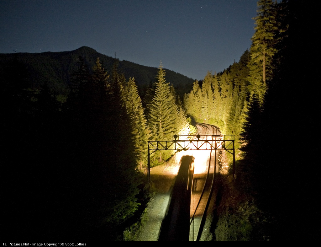 Union Pacific's freight train from Hinkle, Oregon, to Roseville, California, passing under the former Southern Pacific signal bridge at North Cruzatte on moonlit night in the Oregon Cascades. The train is nine miles from the summit at Pengra Pass.