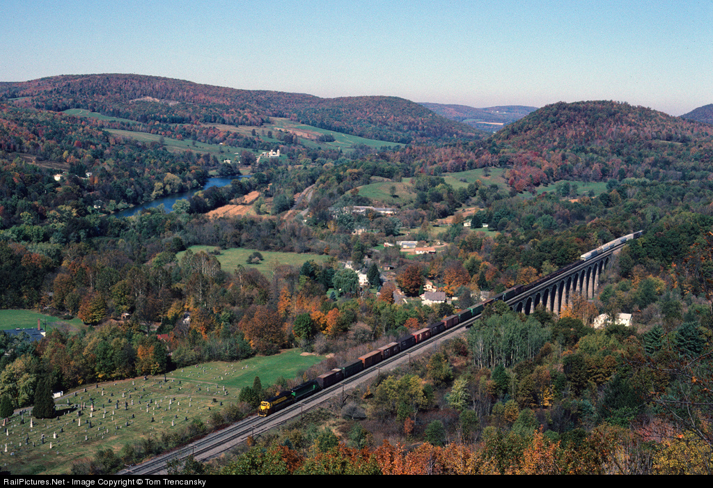 Starrucca Viaduct, built by the Erie in 1848 still carries trains over its massive stone structure. View is taken from an old stone quarry high above the valley, the same quarry that rock for the bridge was mined.