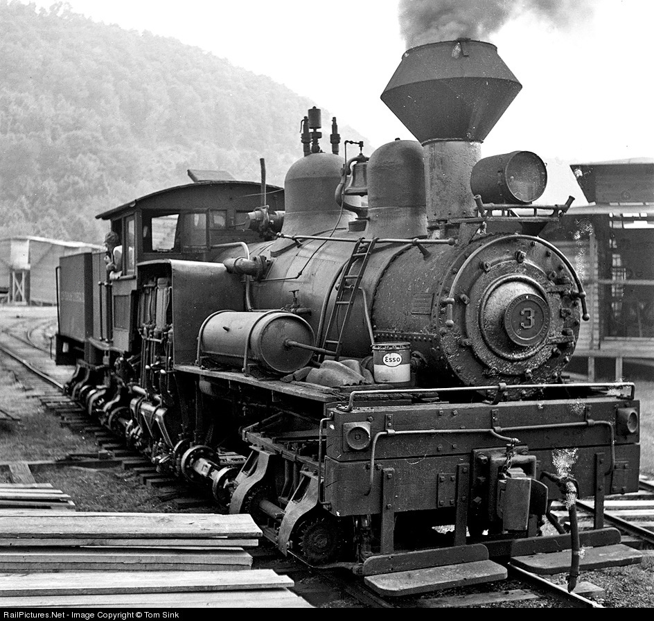 Ely Thomas Lumber mill switcher Shay #3 working at Fenwick, WV in the spring of 1960. This locomotive is preserved in Pennsylvania as a static display.