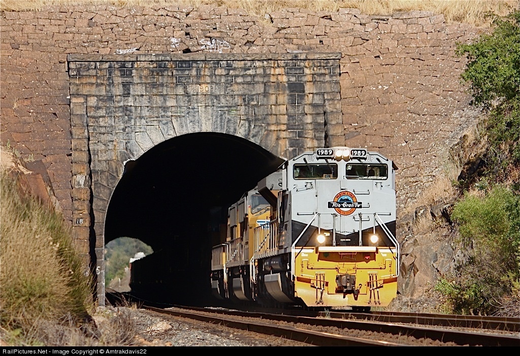 Union Pacific 1989 flies out of the Newcatsle Tunnel and heads west into evening sun.