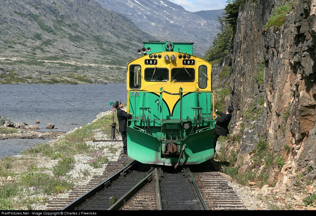 The power that brought us up to the summit as train #41 pulls away to begin its runaround as we become train #42 and prepare for our run back to Skagway, Alaska, and the US of A. The body of water to the left of the engines is Summit Lake, in White Pass, British Columbia. An interesting side note, although we were in Canada, because we did not detrain, we did not need passports. DL535E (aka RSD35) #107 was delivered by the Montreal Locomotive Works in May of 1969, just two months before the first lunar landing.