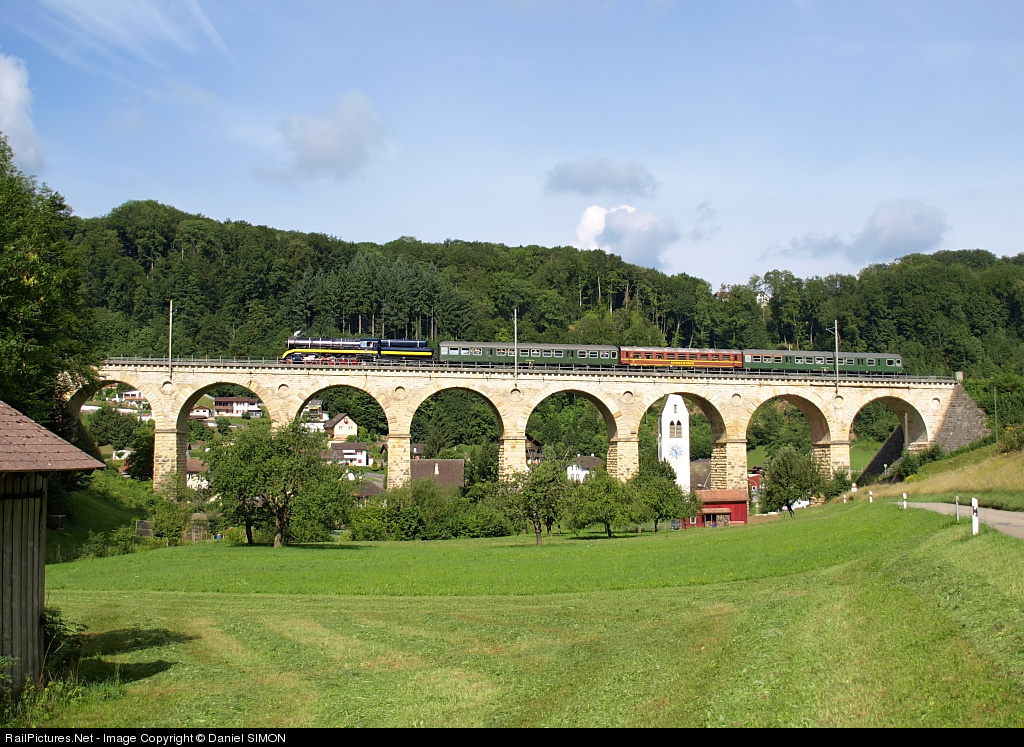 | The most impressive structure on the line between Sissach and Olten is the Rümlingen viaduct, with its eight arches extending over a distance of 128 metres, 25 metres above the ground. It is the oldest large-scale railway bridge in Switzerland. The 'Modern Steam' locomotive 52 8055 is hauling regular excursion trains between Sissach and Olten for a complete week. |
