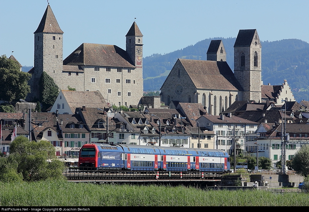 | The suburban train S5 18538 from Pfäffikon SZ to Niederweningen just will aproach the famous city of Rapperswil with the castle of the 12th century. |