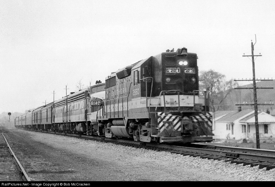 One of the two FP7s on train 42, the eastbound “Pelican” has conked out somewhere south of Bristol, so Southern has tacked on a GP35 (with Alco trucks from a trade-in) to the point of the passenger train. Even though the train has lost its RPO by now (spring 1968), 42 was still hauling a Pullman, a full diner and two coaches, as well as three head end cars (including a baggage car on the rear added at Bristol). The location is Wyndale, VA, just outside of Bristol on the N&W. [Editorial Note: Thanks to Ron Flanary for the caption assistance.]