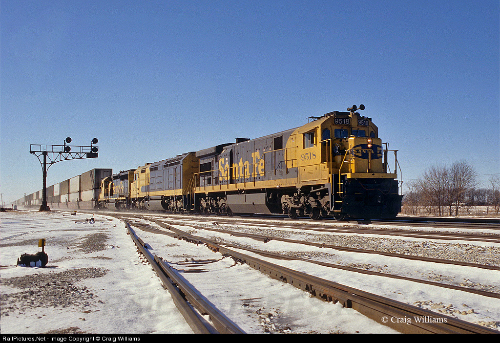 | SF30C leads an eastbound stack train into Galesburg. The train is passing by the crossovers at GI on the west side of town. Most of the Santa Fe SF30C's were sold to either NRE or LRC in mid 1997. Most of these units were built as U36C's from 1973-75, and were rebuilt into SF30C's in 1985-86. |