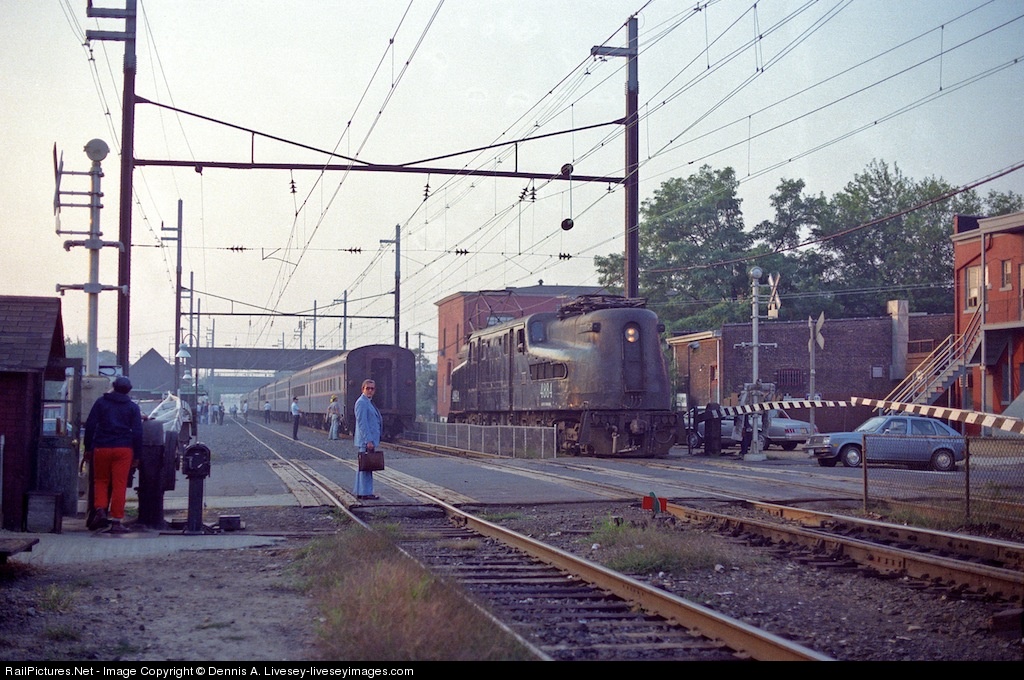 | Soft early morning light bathes South Amboy New Jersey in September 1983. GG-1 4884, after delivering it's train from New York and letting diesels take it on down the "North Jersey Coast Line," is returning to the motor storage yard that is behind the photographer. The crossing gate tender has come out of his ramshackle shanty and lowered the gates on Augusta Street for this move. The train you see has arrived from Long Branch by double GP diesels that cut off moments ago. Soon another G will come out of the yard and tie on to this end and take off to New York. The man in the suit seems more intent on eyeing the photographer than witnessing the life's end of the 139 magnificent GG-1 locomotives. The ten or so remaining will be out of service in little more than a month on October 29, 1983. Kodak 5247 color negative film. P.S. Be sure to see Grif Teller's painting of 4884 in a wonderful story about this engine by David N. Kwechansky in the December 1981 "Trains" magazine. |