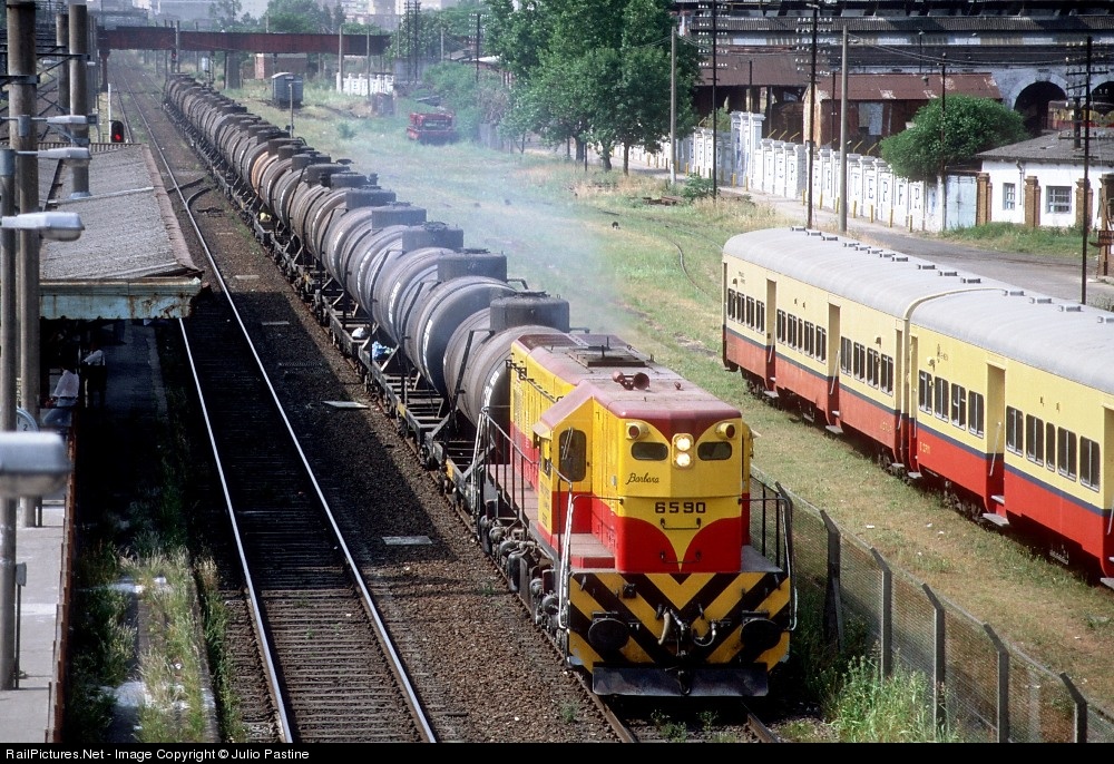 FerroExpreso Pampeano's GR12W #6590 charges with outbound empty tank-cars through the southern Buenos Aires suburbs of Remedios de Escalada, site of the former Main Shops and Stores of the Buenos Aires Great Southern Railroad, both predecessor and builder of the quadruple-track line (half not visible to the left of the picture). Some of the buildings of the Shops are visible to the right of the train. Number 6590, built by EMD in 1962, was the first of FEPSA's units to receive the road's first own paint scheme, a slight variation from the former Ferrocarriles Argentinos' colors with a resemblance of the first scheme the units bore when new, with the rounded corners over the front position lights now in maroon and then in gray.