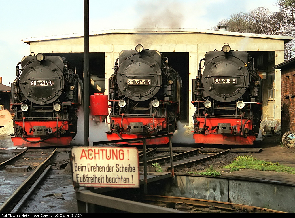 | Three 2-10-2 tender locomotives are waiting for their next duty in the Wernigerode shed. This show can still be witnessed in 2010 as the HSB are still running these beautiful steam locomotives daily between Wernigerode and the Brocken mountain. |