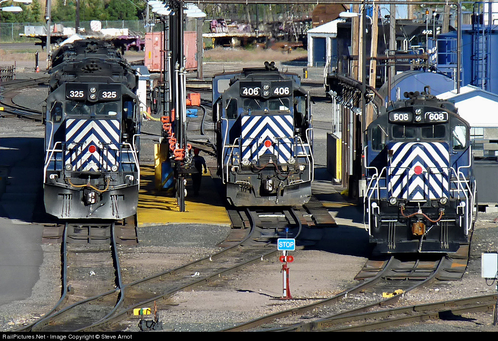 | MRL 325 an ex SP SD45 upgraded to -2 standards, MRL 406 an ex SP GP35, and MRL 608 an ex DM&IR SD9 parked at the engine terminal in Missoula. |