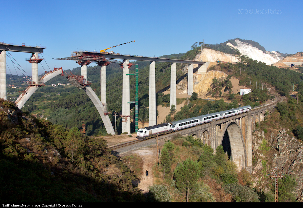 | The old Gundian bridge over Ulla river looks to the new high speed line bridge under construction. Arco train #280 "Camino de Santiago" from La Coruña to Irun and Bilbao, crosses this 85 meters high bridge built in the 50´s to complete Zamora-Santiago de Compostela-La Coruña line. The new viaduct flyes at 125 meters over the river surface. |