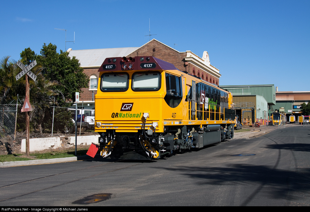 | QR 4137 sits adjacent to a level crossing on Bowen Street outside the Gas Factory with QR 4138 and SMU 287/288 in the background outside the factory for EDI Rail. |