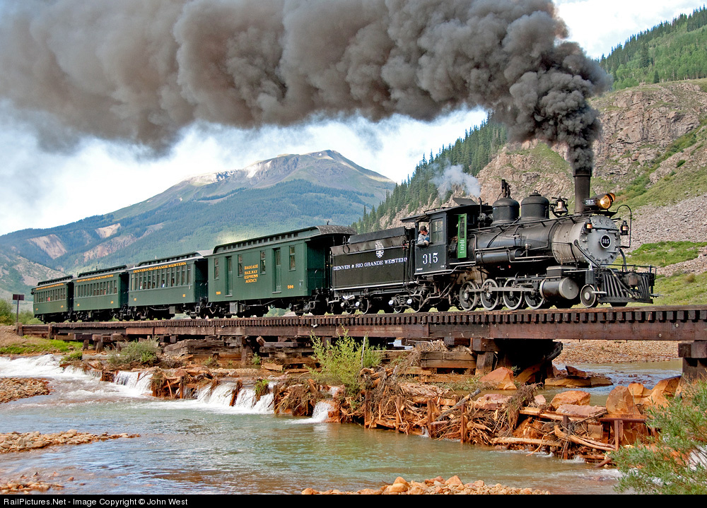 Southbound from Silverton in the late afternoon. The combination of hazy sunshine and the reflection of light off the mineral stained rocks below the bridge produced an interesting lighting effect. We were arriving Silverton but turned the train on the wye to get this southbound shot, and then backed into town.