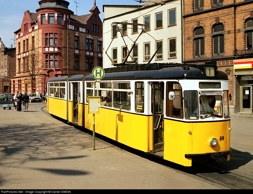| The G4-61 number 59 is an articulated tramway that has been built in 1962 by the VEB Gotha. In a few minutes, it will leave the Bahnhof station and return to the Oberstadt. |