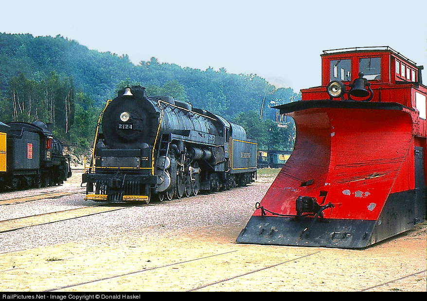 | This famous Iron Horse Rambles Engine ran out of time and had to retire early to Steamtown in Vermont while three other sisters continued to steam up until the 90's. This magnificent Northern now resides at Steamtown USA in Pennsylvania. The big red wedge to our right, I believe, was the prototype for the Ambroid One of 500 B&M snow plow kits. |