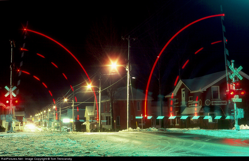 Crossing gates on Christmas Eve in Brockville, Ontario. The night time Cavalier, westbound, has begun to pull out of the station. Train is extremely heavy and was led by a MLW FPA4 power set.