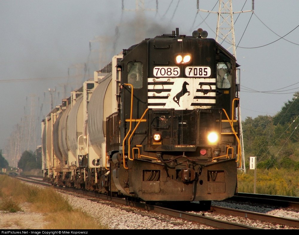 | NS 7085 was delivered to Southern in June of 1981. 29 years later it is spotted working hard on the point of the evening local L63 which runs the NS Wabash Line from Oakwood Yard in Melvindale, MI to Bellville, MI with a vintage Norfolk and Western caboose in tow. |