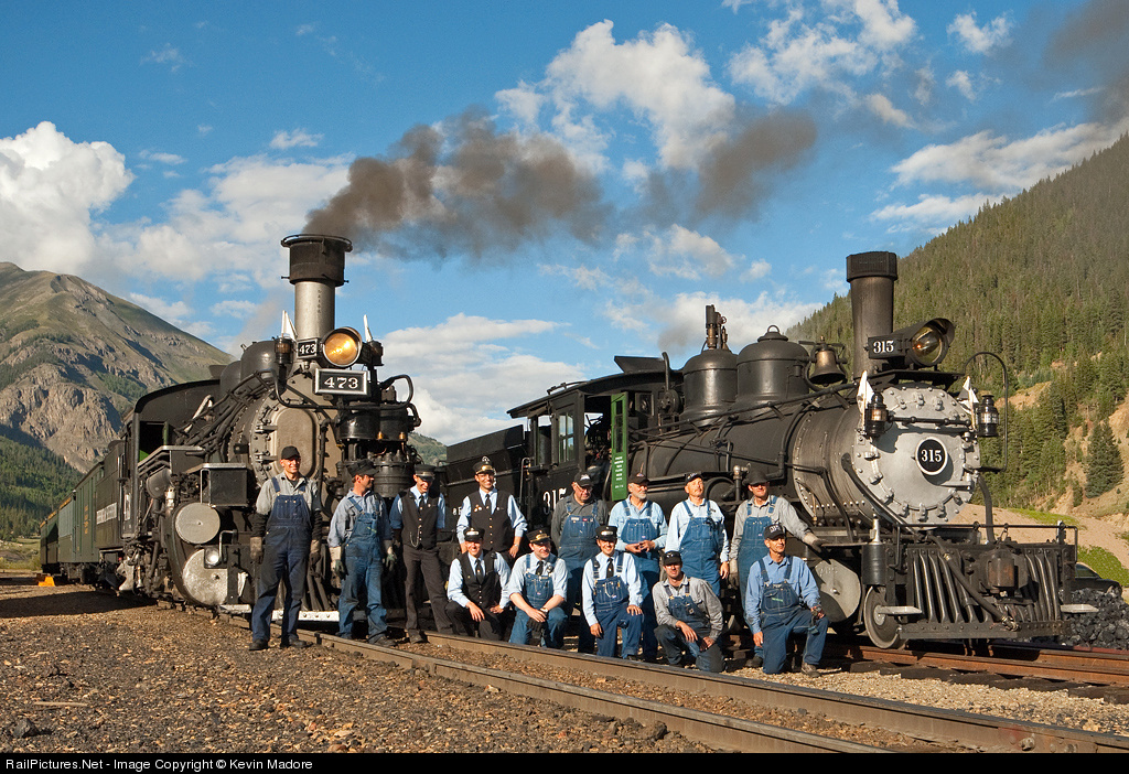 Carrying the torch for the Rio Grande. Several generations of narrow gauge railroaders pose with two generations of D&RGW Locomotives at Silverton, Colorado in evening light. The railroaders are crewmembers from the Durango & Silverton Narrow Gauge Railroad and the Durango Railroad Historical Society. The locomotives are Alco K-28 #473, now operated by the DSNG, and Baldwin C-18 #315, now operated by the DRHS. I find this image particularly uplifting, not only because the historic hardware has been so nicely preserved, but also because of the number of young faces I see in this group, who stand ready to carry the torch for the Rio Grande for years to come.
