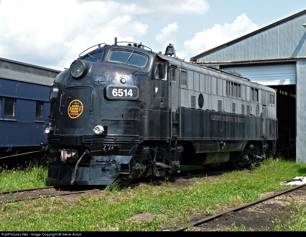 Alberta Railway Museum FP9 6514 entered service in 1/57 as CN 6514, then became VIA 6514 in 1978, and then Algoma Central 1753 in 1995. Retired in 2001, AC 1753 was donated to the Alberta Railway Museum in 2003.