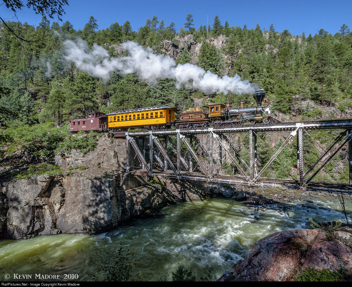 There is only one narrow gauge, wood-burning, 4-4-0 American that is still operational, and she is depicted here on the DSNG, crossing the High Bridge at Tacoma on a northbound run to Cascade Canyon. Owned by Las Vegas Attorney Dan Markoff, the beautiful Eureka & Palisade #4...or "Eureka" also holds the distinction of being the only 19th century, wood-burning 4-4-0 of any gauge that still runs occasional wilderness passenger excursions. I had the pleasure of riding in the caboose on this trip and getting to chat with Mr. Markoff about this special locomotive. Folks often wonder why Eureka seems limited to this two-car consist. Mr. Markoff explained that the coaches on the D&S are considerably heavier...nearly twice the weight...of the coaches Eureka pulled in her day. He also indicated that quality of the fuel she burns has a lot to do with her performance. According to Mr. Markoff, wood generally comes in 4 grades. The two most common are "Uphill Wood" and "Downhill Wood", which are terms that pretty much describe what the engine can do with them. He classifies the extremes as "Atomic" (which lifts the pops frequently if the Fireman isn't paying attention) and "Death Wood" (which basically puts the fire out!). When asked to classify the wood supplied for our trip on this particular day, his assessment was that it was somewhere between "Uphill" and "Atomic".....pretty good stuff! And sure enough, Eureka performed superbly climbing the grades up to Cascade.