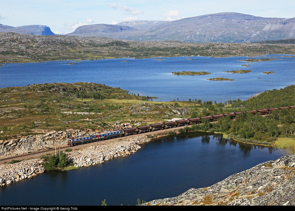 | Dm3 1202-1231-1201 "Kunigunda" with ore train 9930 from Kiruna to Narvik is passing a little lake between Vassijaure and Katterjåkk near the swedish/norwegian border, in the background Lake Vássejávri. |