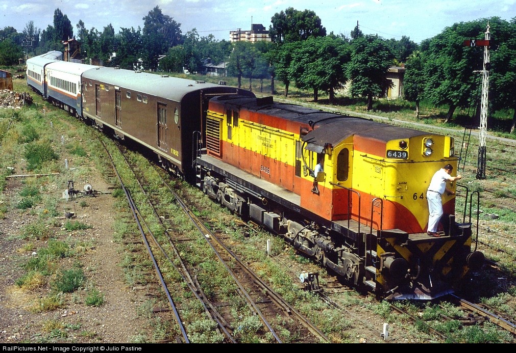 | The San Juan to Mendoza section of train number 566 "El Aconcagua" enters General San MartÃn Railroad's Mendoza Station with ALCo.-MLW RSD35 # 6439 for power. At Mendoza this 5-coach+baggage consist will join the Mendoza to Buenos Aires section to make a 15-car train. Dual-gauge track in the foreground was formerly used by meter-gauge trains of the General Belgrano Railroad, whose passenger service over the Trasandino Railroad combined with General San Martin's trains at this station to reach the border town of Las Cuevas and offered international service through the Andes Range to Santiago de Chile, Capital City of the Chile Republic. |