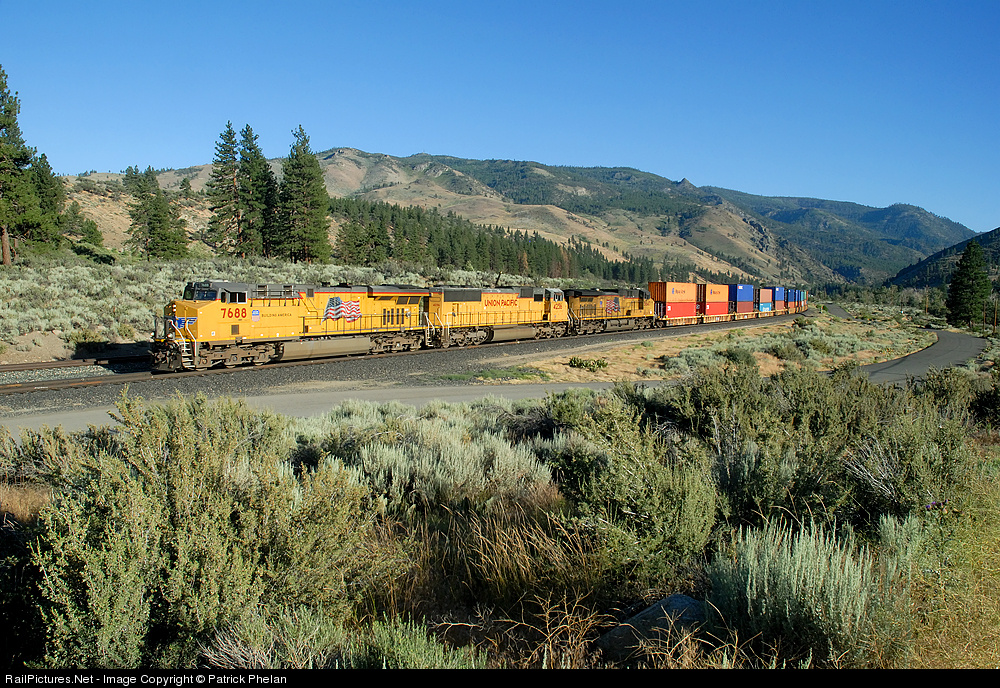 | A WB UP stack train descends Donner Pass at Verdi, after just crossing the state line into Nevada from California. |