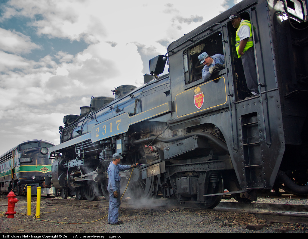 | The fireman has dumped 2317's fire and is now washing the hopper making sure all the ash has been removed. This procedure has been performed on 2317 every working day for years but there is a difference this time. She is now due for her FRA mandated overhaul and it is not known exactly when her whistle will again play off Scranton's mountains. I myself missed the real steam era and all the personal experience of that transition. But knowing the respect Steamtown's crews have for this engine, I now understand the regret men of the past and of today have felt as they put down a beloved friend. |