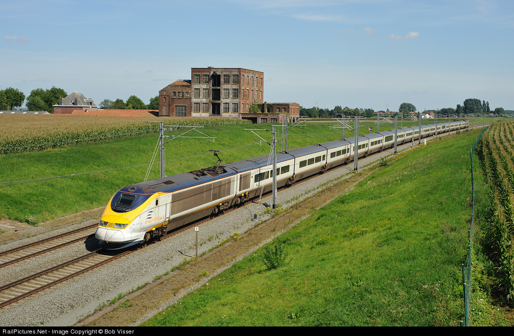 | SNCF TMST-trainsets 3216+3215 pass an old abandoned factory on their journey from Brussel Zuid to London St. Pancras International. TMST=TransMancheSuperTrain. |