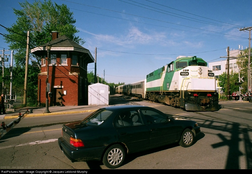 Whoops! This unlucky motorist got him/herself caught between the gates at the Westminster Ave. crossing in Montreal West. This is something that repeats itself time and time again each rush hour, due to the fact that there are two T-junctions that flank the crossing on either side. The end result is that, no matter how careful one is, cars almost always find themselves backed up over the tracks. Thankfully, the train speed through the station is only 15MPH, and in all the years I've lived here, I have never seen a collision between a train and a car.